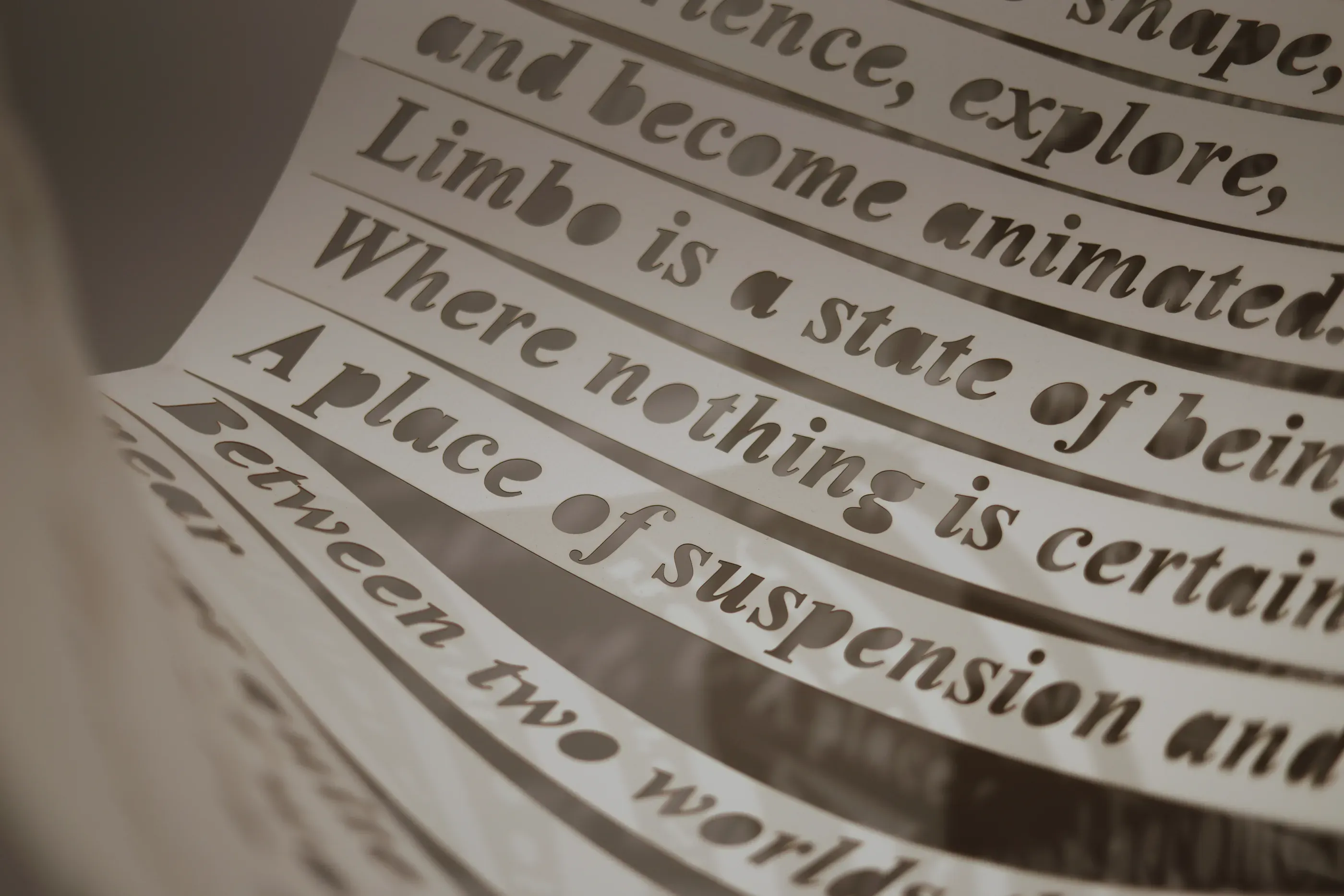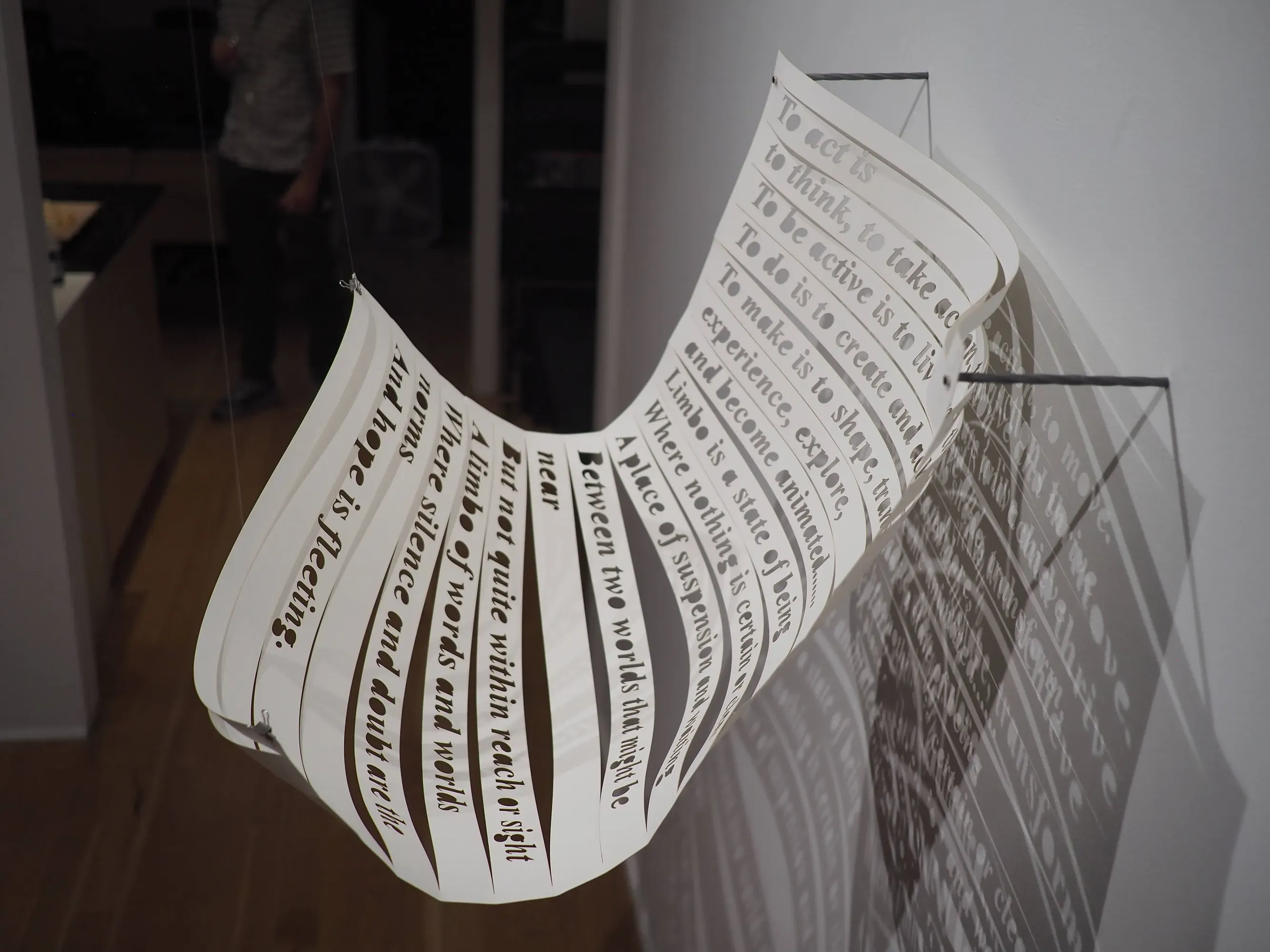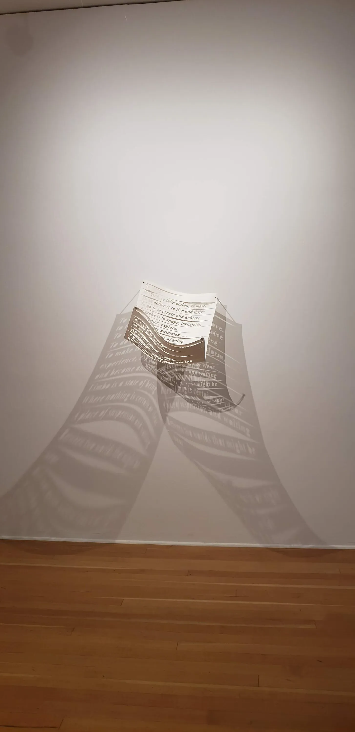 Limbo is characterized by fluttering shadows, a stagnant cycle of looking and pausing, and a sequestered frame of mind. It is a never-ending cycle of searching and waiting, an imposed state of loneliness and isolated reactions. Our bodies endure limbo and the only way to be liberated is to act in concert. This artwork consists of a paper cutout blocking a light source, which then casts the shadow of two of my poems inspired by last year’s uprising in Iran. The white sheet endures the unbearable weight of the paper pulling down on the edges, yet the shadows cast by the inscription relax the tension, affording the freedom to wander. Shadow has become a medium of curiosity for me since I first visited North America in 2012. I am especially drawn to the ways in which the experience of embodiment can be expressed through shadow. In this work, I was preoccupied as much with the legibility/illegibility of the poems as with encouraging the audience to develop a corporeal connection by making the shadow palpable. The poems navigate the complex emotions of witnessing the exciting and hopeful act of standing and acting together, yet at the same time, feeling anger, guilt, and despair as voyeuristically watching the unfolding of harrowing events and the mutilated bodies of unarmed protestors from a safe distance.