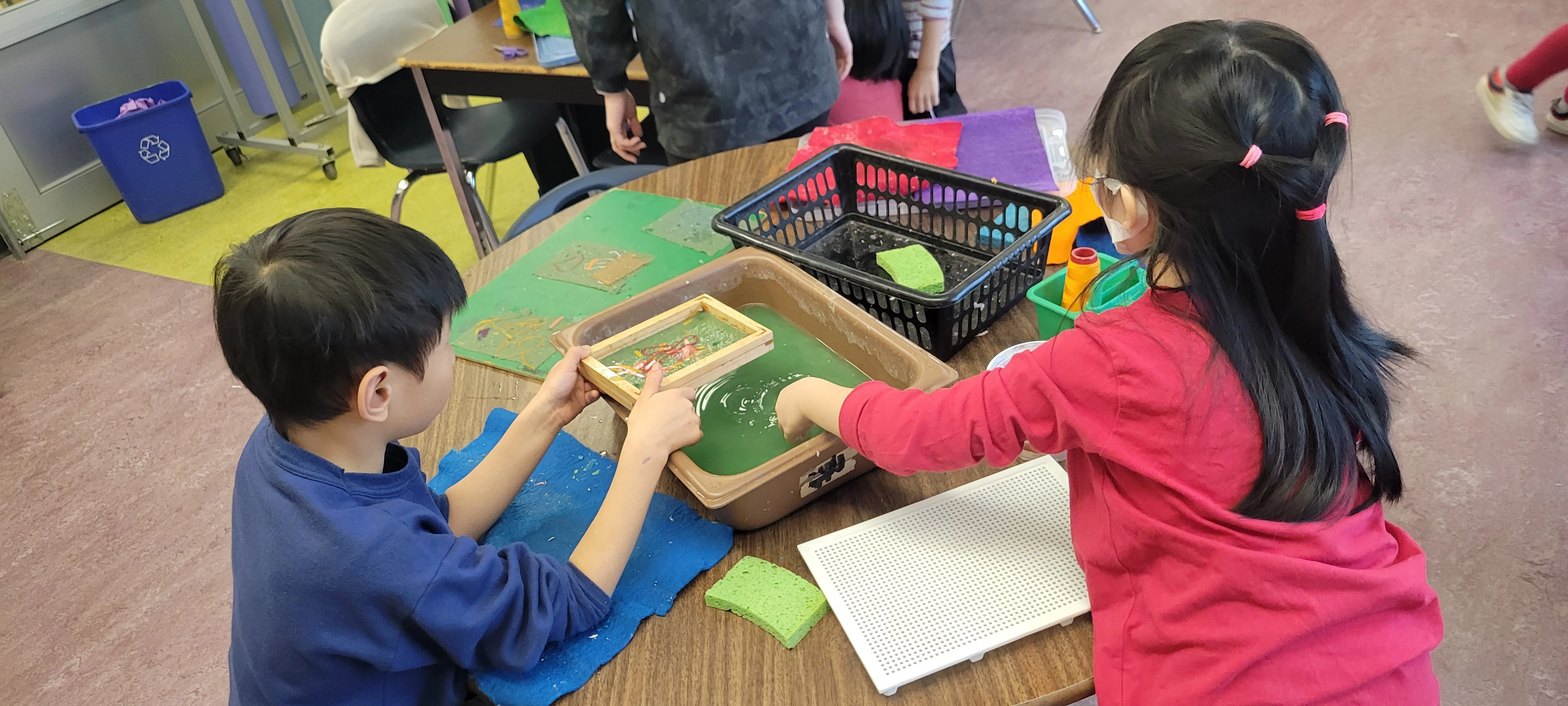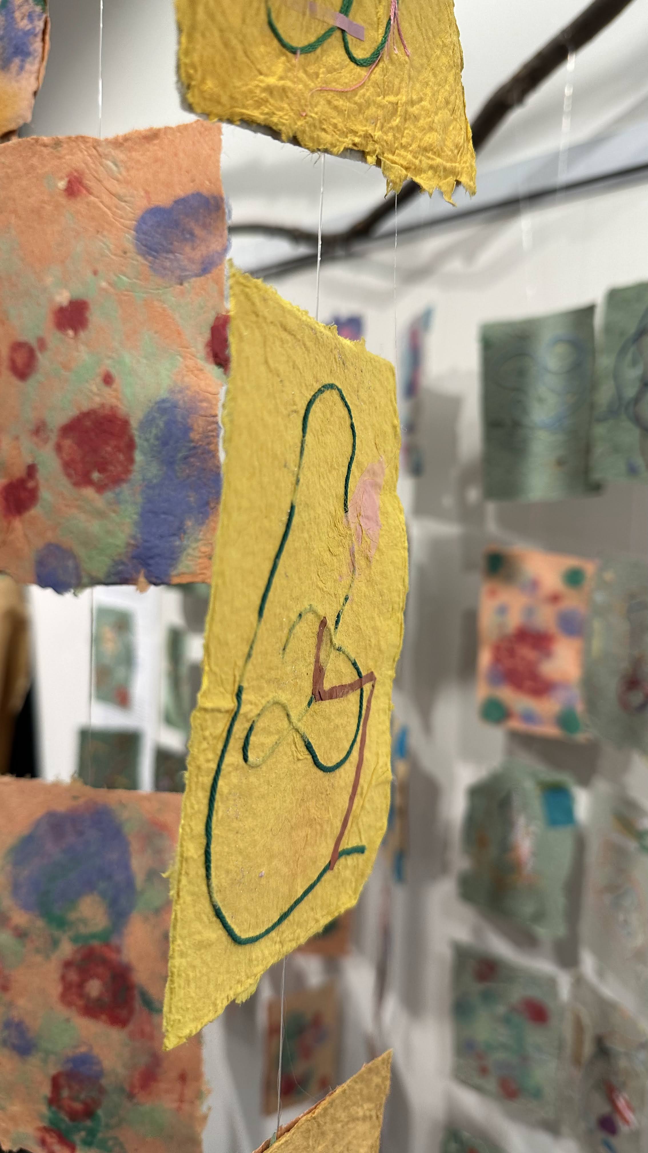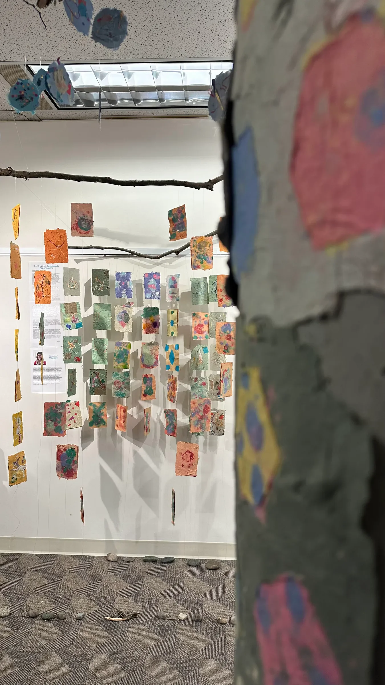 During my sixth-month artist residency with the AIRS program at Douglas Elementary in Vancouver, BC, I worked with grades 2-4 students to explore the transformative art of papermaking. Students learned to recycle paper from their own school, discovering techniques in making paper, adding natural materials such as leaves, drawing with materials such as yarn and threads, painting with dyed pulp, and creating textures with various materials. Students developed tactile awareness and artistic expression through twelve focused sessions while learning about environmental impact. The process emphasized patience, teamwork, and sustainability as students transformed waste paper into handmade art. Students practiced attunement and careful observation, engaging with materials through touch and creative exploration. Each session built their understanding of texture, material properties, and emotional expression through hands-on learning. This journey culminates in a site-specific installation at the Vancouver School Board in May 2024, showcasing their artistic exploration and environmental consciousness through transformed paperwork.