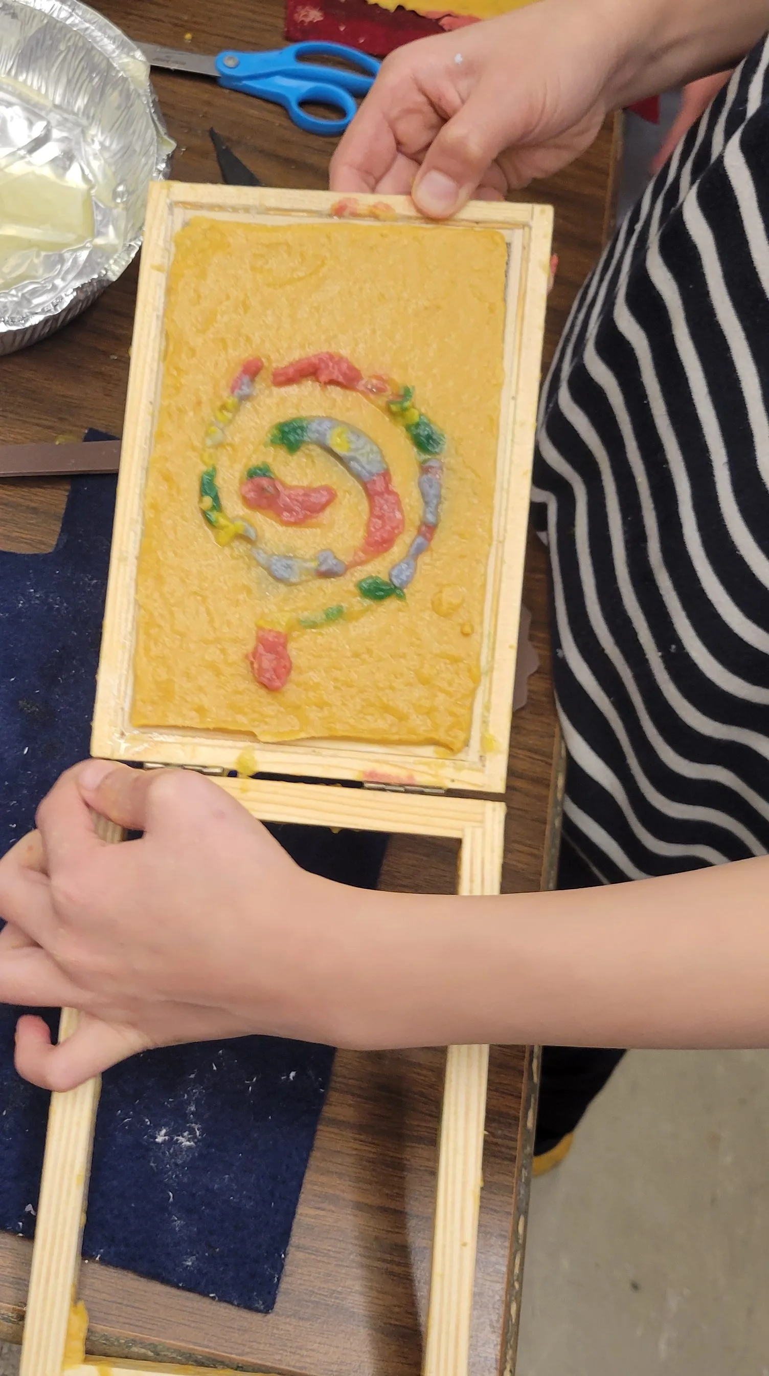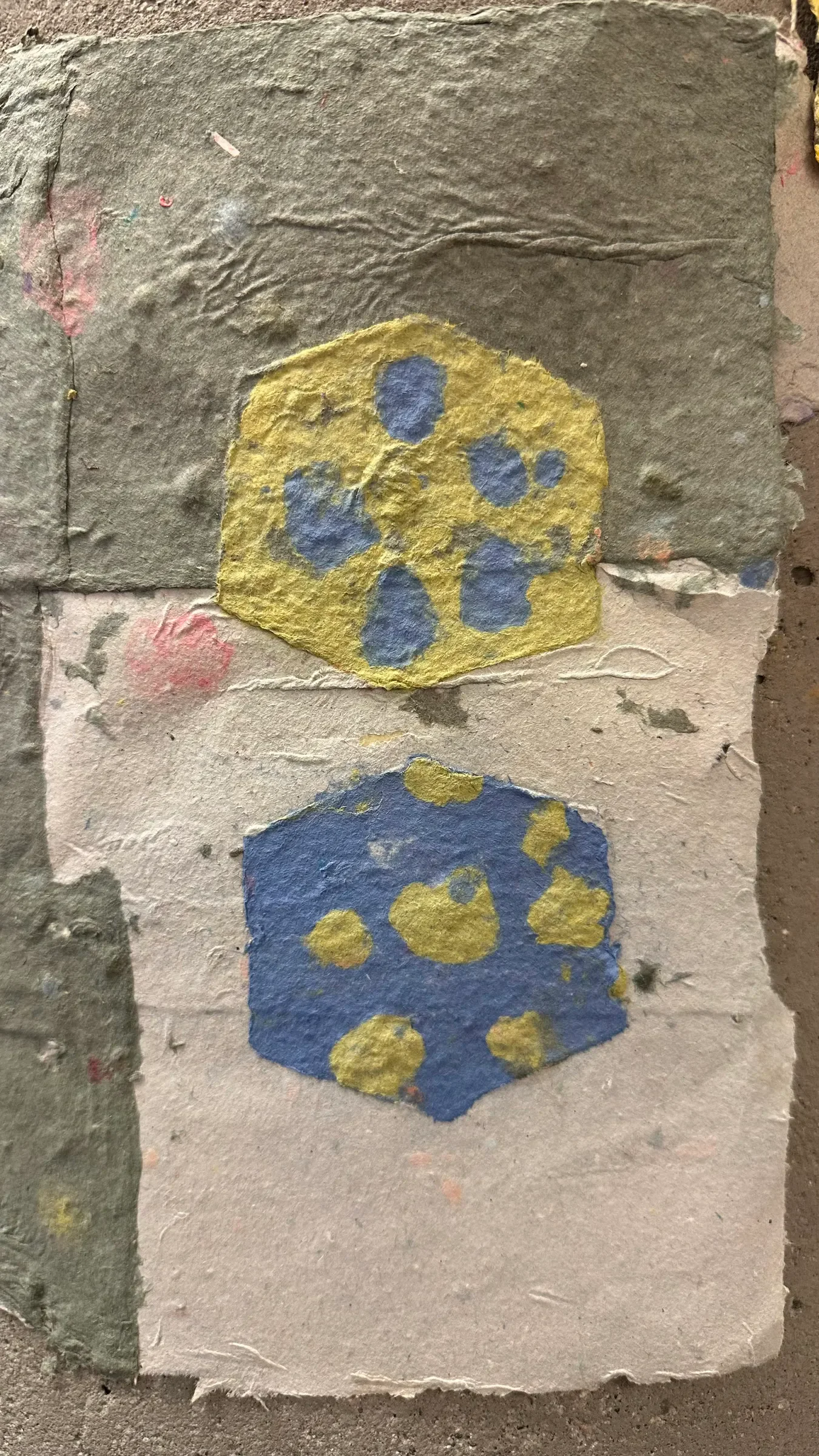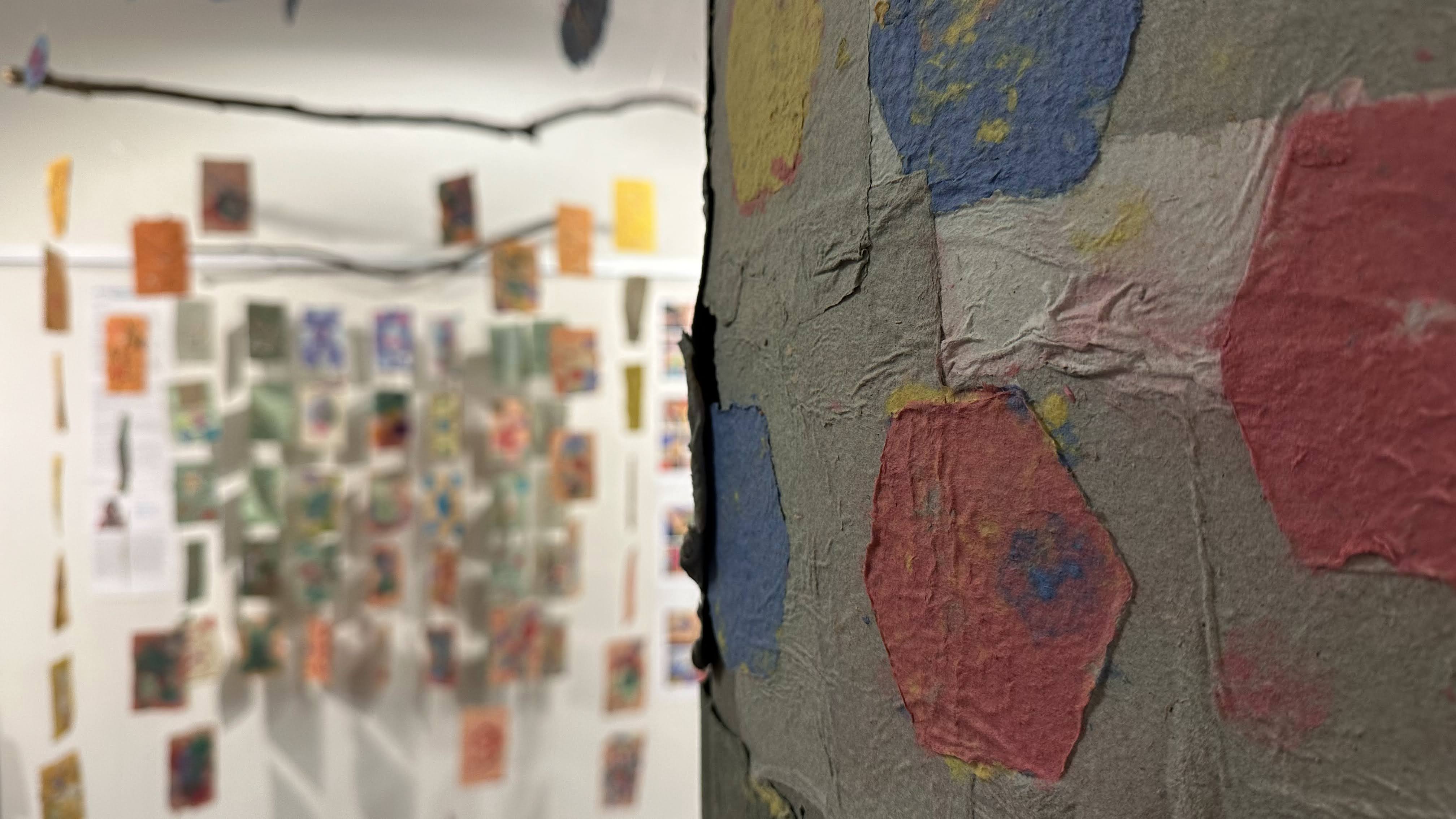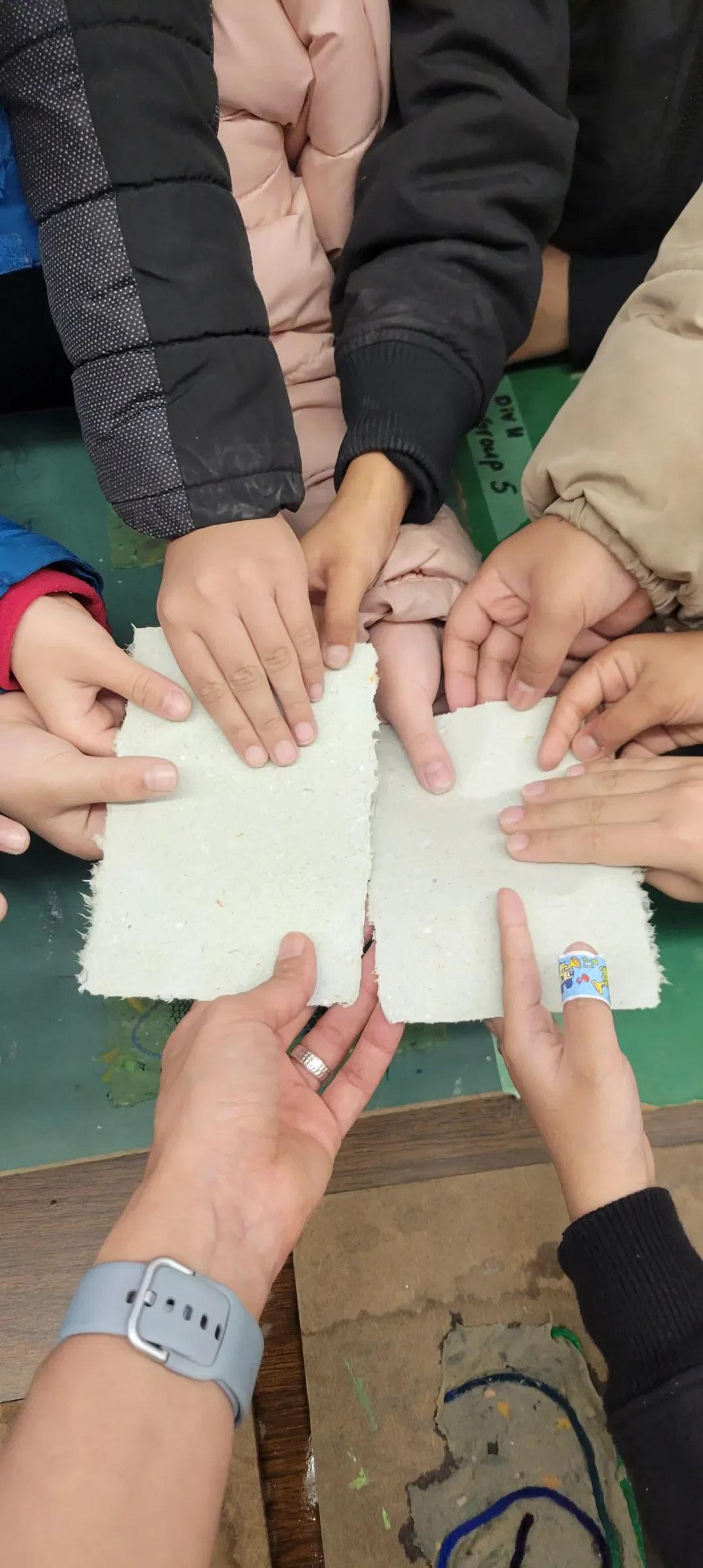 During my sixth-month artist residency with the AIRS program at Douglas Elementary in Vancouver, BC, I worked with grades 2-4 students to explore the transformative art of papermaking. Students learned to recycle paper from their own school, discovering techniques in making paper, adding natural materials such as leaves, drawing with materials such as yarn and threads, painting with dyed pulp, and creating textures with various materials. Students developed tactile awareness and artistic expression through twelve focused sessions while learning about environmental impact. The process emphasized patience, teamwork, and sustainability as students transformed waste paper into handmade art. Students practiced attunement and careful observation, engaging with materials through touch and creative exploration. Each session built their understanding of texture, material properties, and emotional expression through hands-on learning. This journey culminates in a site-specific installation at the Vancouver School Board in May 2024, showcasing their artistic exploration and environmental consciousness through transformed paperwork.